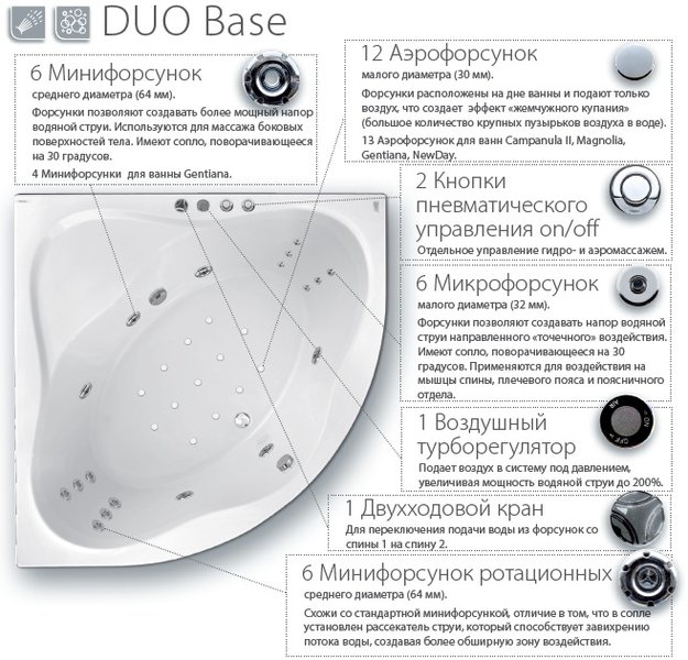 12 Аэрофорсунок малого диаметра (30 мм). Форсунки расположены на дне ванны и подают только воздух, что создает эффект «жемчужного купания» (большое количество крупных пузырьков воздуха в воде). 13 Аэрофорсунок для ванн Campanula II, Magnolia, Gentiana, NewDay.