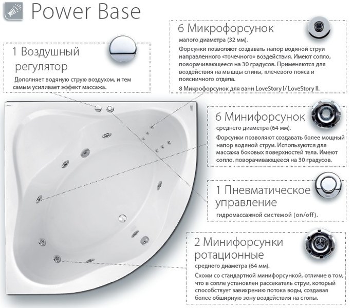 6 Микрофорсунок малого диаметра (32 мм). Форсунки позволяют создавать напор водяной струинаправленного «точечного» воздействия. Имеют сопло, поворачивающееся на 30 градусов. Применяются для воздействия на мышцы спины, плечевого пояса и поясничного отдела. 8 Микрофорсунок для ванн LoveStory I/ LoveStory II.
