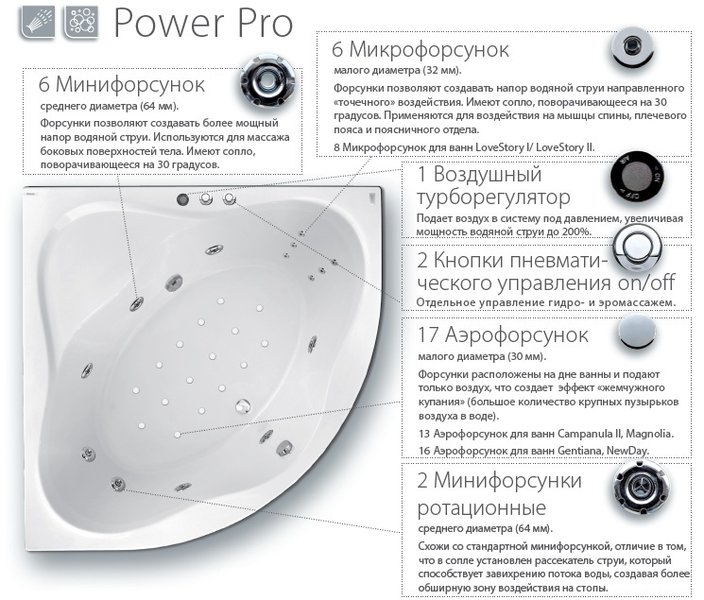 6 Микрофорсунок малого диаметра (32 мм). Форсунки позволяют создавать напор водяной струи направленного «точечного» воздействия. Имеют сопло, поворачивающееся на 30 градусов. Применяются для воздействия на мышцы спины, плечевого пояса и поясничного отдела. 8 Микрофорсунок для ванн LoveStory I/ LoveStory II.