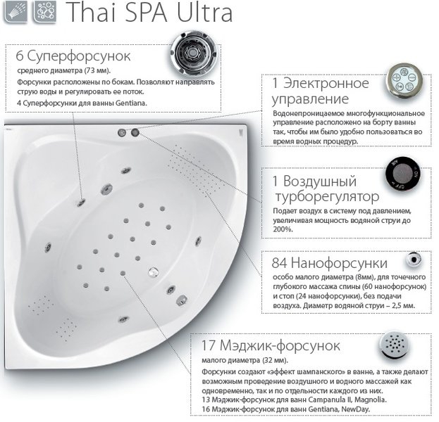 6 Суперфорсунок среднего диаметра (73 мм). Форсунки расположены по бокам. Позволяют направлять струю воды и регулировать ее поток. 4 Суперфорсунки для ванны Gentiana.