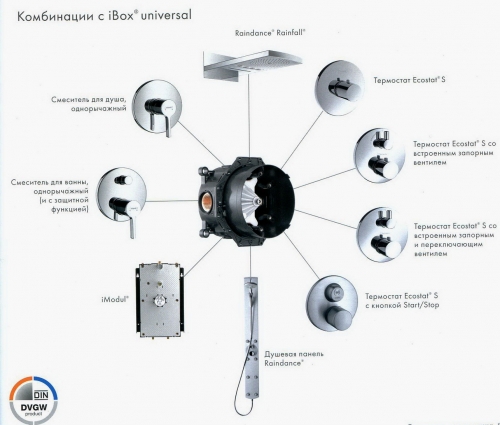 Hansgrohe ibox universal - один для всех. ibox universal от Hansgrohe делает скрытый монтаж простым. Ibox universal является первой в мире скрытой частью, подходящей ко всем обычным и термостатическим смесителям на 1/2 или 3/4. Все термостаты Hansgrohe и Axor совместимы с ibox universal, а его новейший вариант оснащен гибким переключающим кольцом для большего удобства при монтаже. Подходящий ко всем типам и видам монтажа, ibox universal полностью герметичен и обеспечивает хорошую звукоизоляцию, в добавок к тому в комплект поставки сразу включен промывной блок. Убедитесь сами в преимуществах ibox - поистине революционного в области скрытого монтажа продукта.
