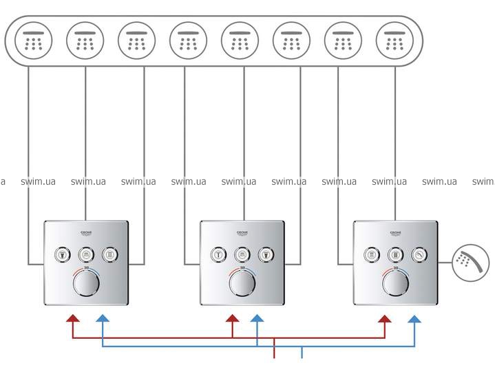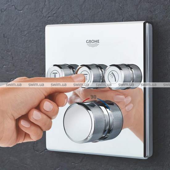 Панель управления GROHE EasyLogic® проста и понятна для пользования за счет удобной маркировки всех составляющий ее элементов. С помощью технологии GROHE SmartControl® переключение между ремами струи, их комбинация и регулировка силы потока воды осуществляется простым нажатием на необходимую кнопку и поворачиванием регулятора до достижения необходимого напора.
