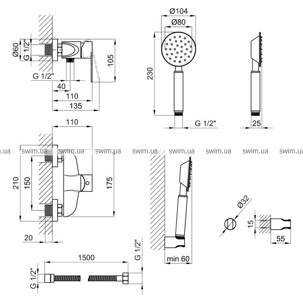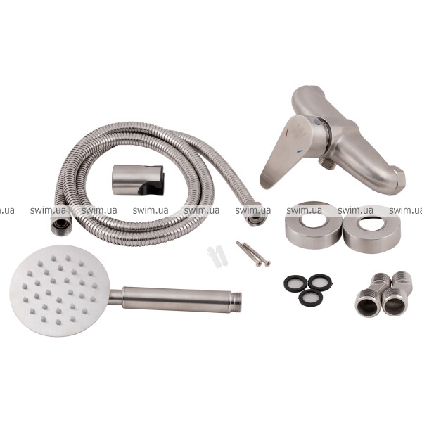 - Комплектация Смеситель, кронштейн для ручного душа, лейка для ручного душа, душевой шланг, крепежи.