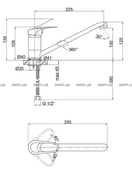 - Длина излива, мм 225