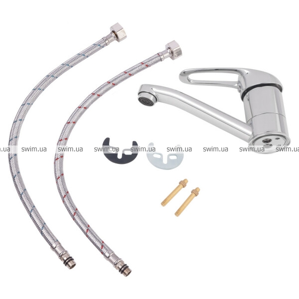 • Комплектация     Смеситель, гибкая подводка, крепежи.