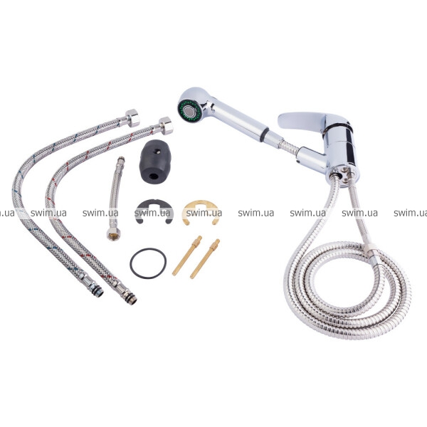 - Комплектация Смеситель, гибкая подводка, шланг для выдвижной лейки, якорь, крепежи.
