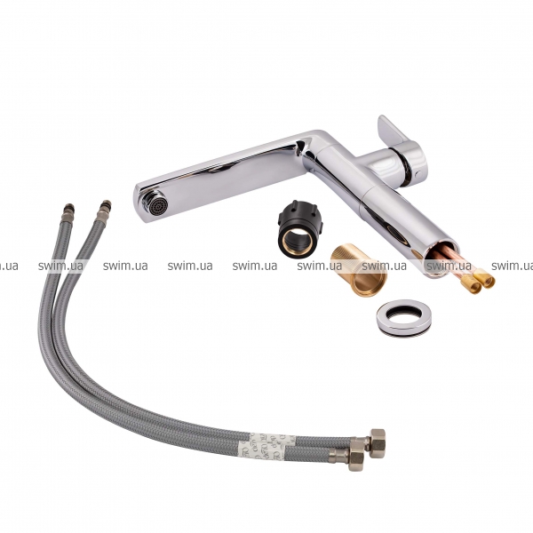 - Комплектация: смеситель, гибкая подводка, крепежи.