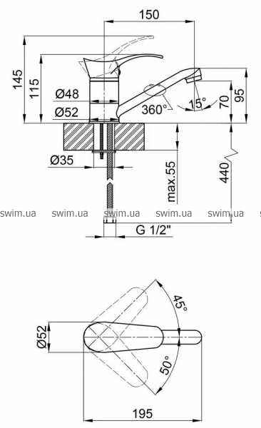 - Длина излива, мм: 150