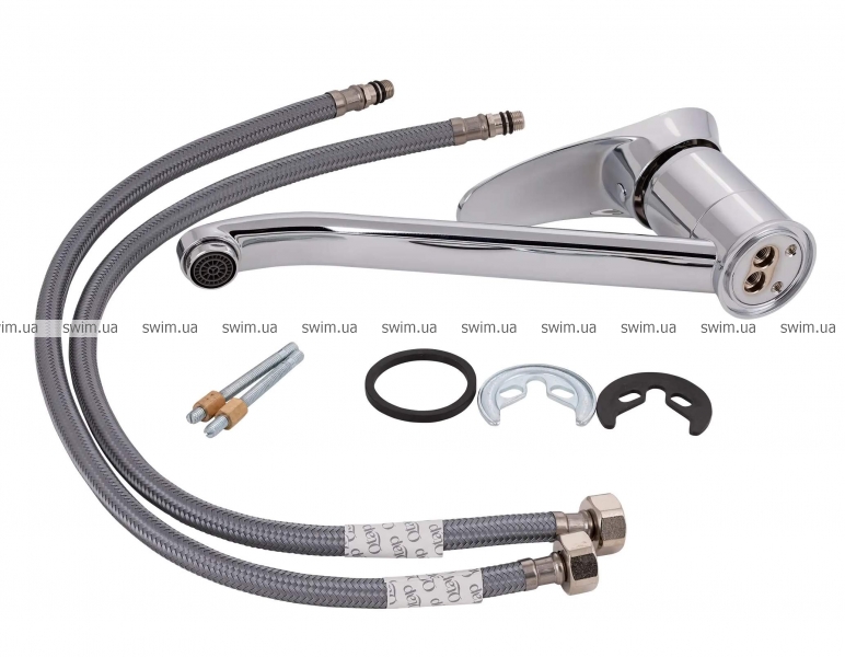 - Комплектация: смеситель, гибкая подводка, крепежи