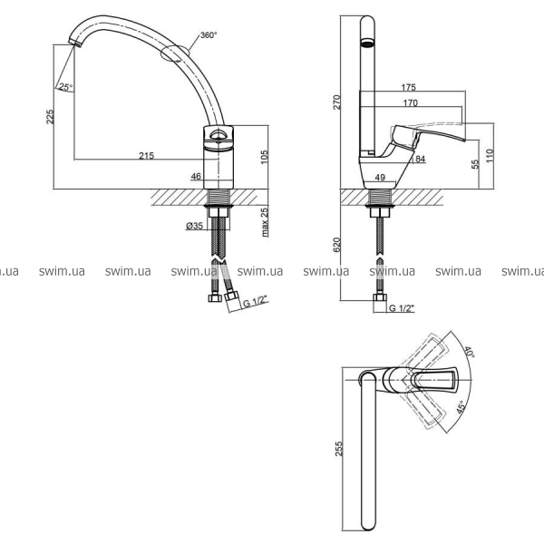 - Комплектация: смеситель, гибкая подводка, крепежи