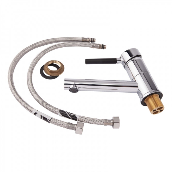 - Комплектация: смеситель, гибкая подводка, крепежи