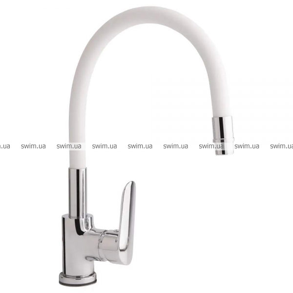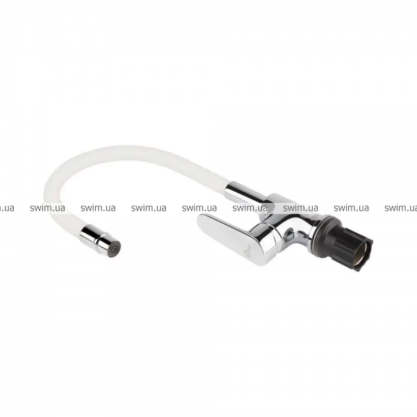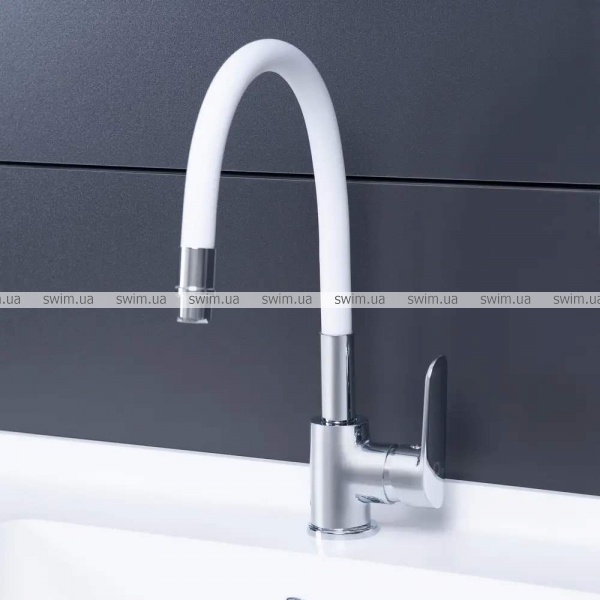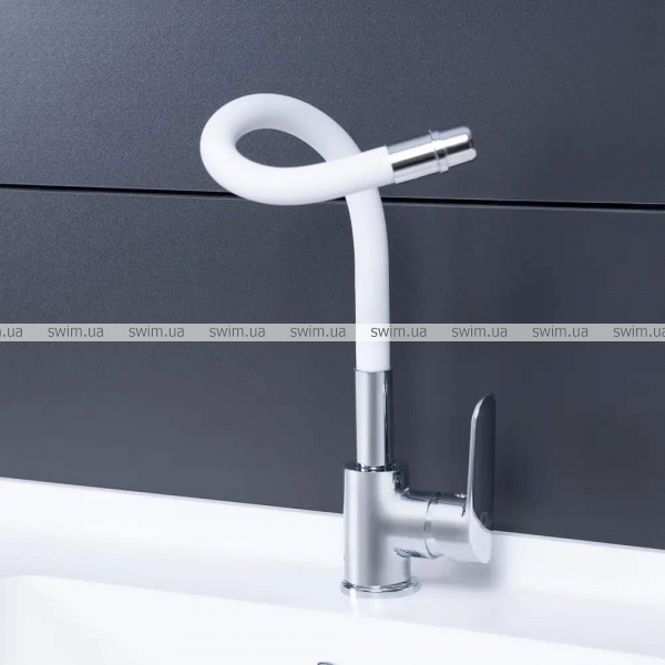 - Излив смесителя прорезиненный и имеет матовую фактуру. Длина гибкого подвода 430 мм.