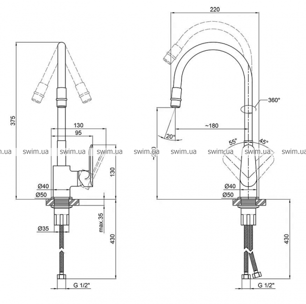 - Высота излива, мм: 220