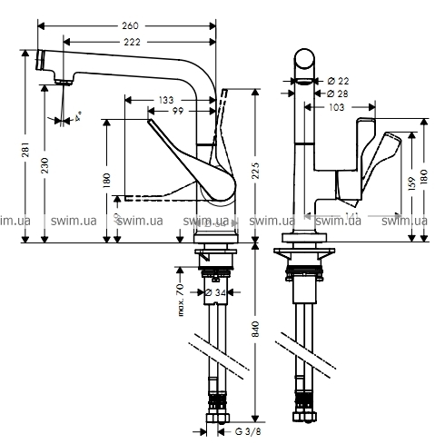 - угол поворота излива регулировка на 3 уровня 110°, 150° или 360°