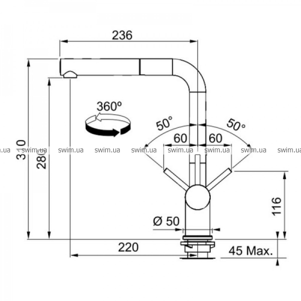 - Особенности модели: угол поворота излива 360°, многоуровневый аэратор