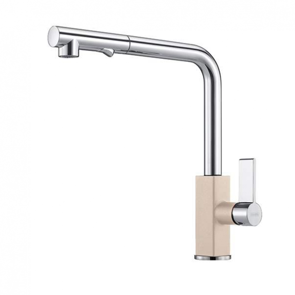 Akros – экстравагантность прибора в дополнение к компактному размеру служит отличным вариантом использования в тандеме с глубокой раковиной под столешницу. Здесь есть выдвижной шланг и угол оборота 360°.