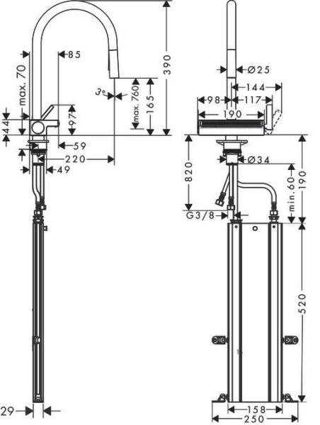 - угол поворота излива: регулировка на 3 уровня на 60°, 110° или 150°