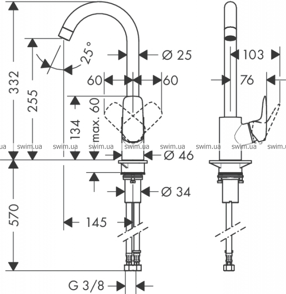 - угол поворота излива регулировка на 3 уровня на 110°, 150° или 360°