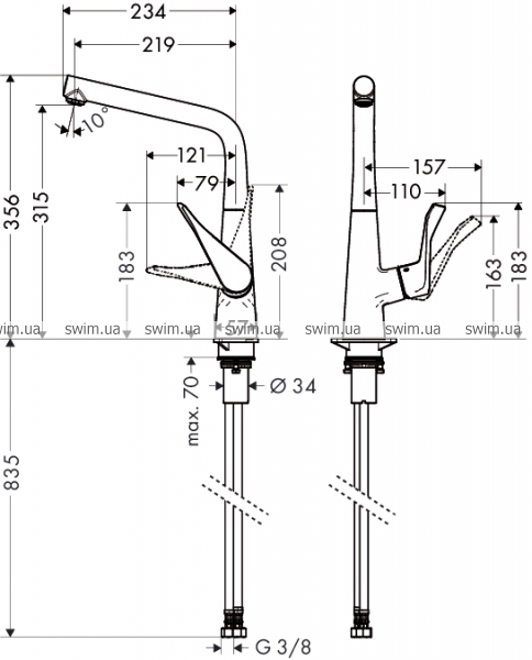- угол поворота излива регулировка на 3 уровня на 110°, 150° или 360°