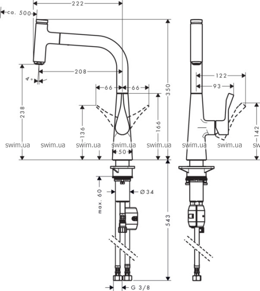 - угол поворота излива: регулировка на 2 уровня, на 110° или 150°