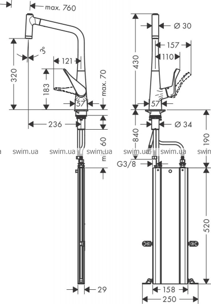 - диапазон поворота излива регулируется в 2 шага до 110 ° или 150 °