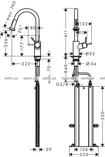 - состоит из: однорычажного кухонного смесителя, короба для шланга