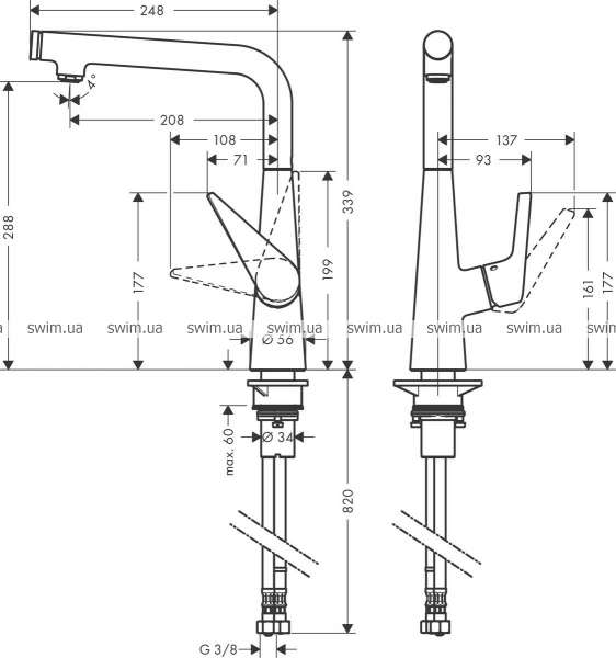 - угол поворота излива регулируется в 3 шага: 110 °, 150 ° или 360 °