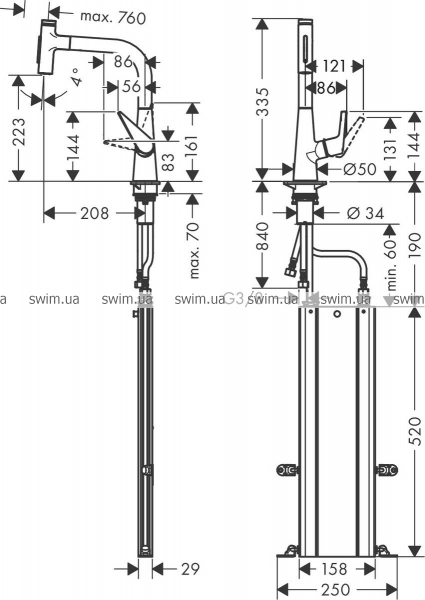 - диапазон поворота излива регулируется в 2 шага до 110 ° или 150 °