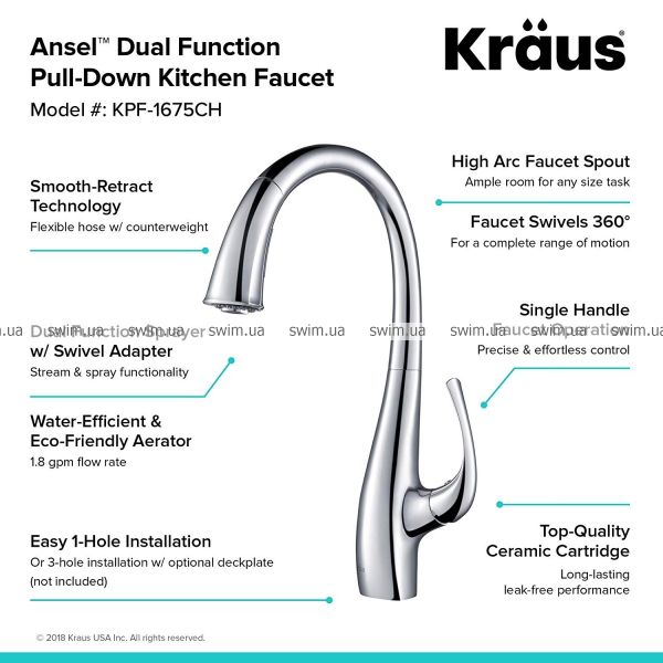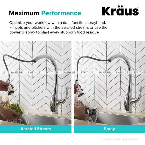 Модернизируйте свою кухню с помощью элегантного крана с выдвижным душем KRAUS Ansel ™, оснащенного двухфункциональной распылительной головкой с гибким шлангом и поворотным адаптером, который обеспечивает легкое перемещение по всей мойке.