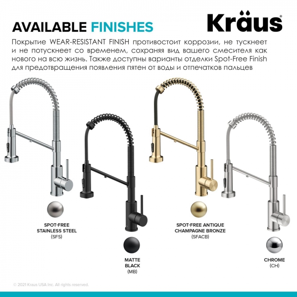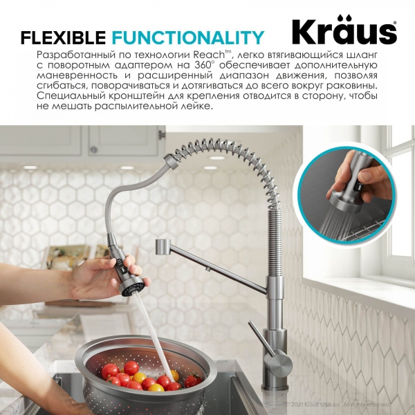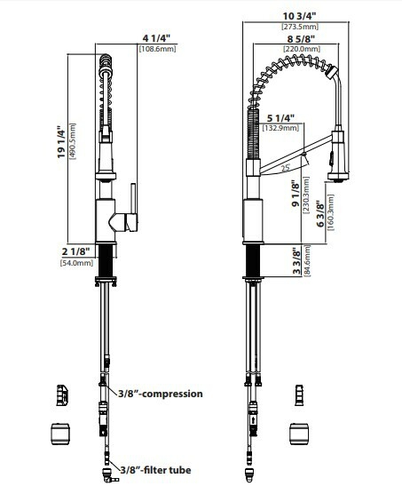 Ручка с одним рычагом управляет потоком как водопроводной, так и для фильтрованной воды; просто поверните ручку до упора вперед, чтобы активировать функцию фильтрации. Оптимизированный для использования в жилых помещениях, Bolden создает привлекательный индустриальный образ благодаря высокому дугообразному изливу с открытой спиралью и обладает преимуществом компактной высоты, которая подходит там, где другие смесители коммерческого типа не помещаются. Выдвижной излив с поворотным адаптером обеспечивает превосходную маневренность и расширенный диапазон движения, позволяя вам дотянуться до всего вокруг кухонной мойки.