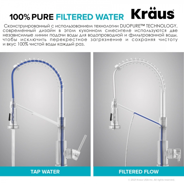 Конструкция 2-в-1 устраняет необходимость в отдельной системе очистки воды или громоздком фильтре, монтируемом на кран, что улучшает внешний вид и функциональность вашей кухни. Созданный по технологии DuoPure™, этот инновационный кухонный смеситель имеет две независимые линии - для обычной и фильтрованной воды, предотвращая возможность перекрестного загрязнения и обеспечивая 100% очищенную воду каждый раз.