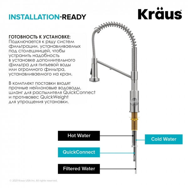 Универсальная конструкция 2-в-1 подключается к выбранной вами системе фильтрации воды, включая обратный осмос, чтобы обеспечить легкий доступ к фильтрованной воде для питья, приготовления пищи и наполнения бутылок.