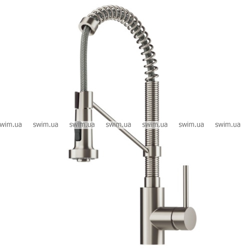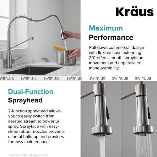 Пружинный смеситель подходит для большинства кухонь, в том числе и для тех, где предусмотрены навесные шкафы. Гибкий шланг длиной 51 см обеспечивает превосходную маневренность, а двухфункциональная распылительная головка дает пользователям возможность в мгновение ока переключаться из режима аэрированного потока в режим мощного спрея.