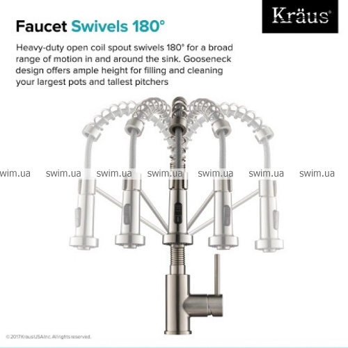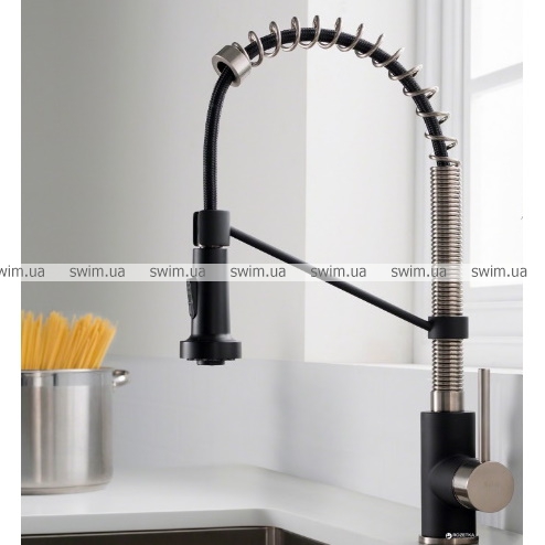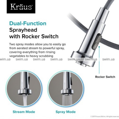Пружинный смеситель подходит для большинства кухонь, в том числе и для тех, где предусмотрены навесные шкафы. Шланг длиной 51 см обеспечивает превосходную маневренность, а двухфункциональная распылительная головка дает пользователям возможность в мгновение ока переключаться из режима аэрированного потока в режим мощного спрея.