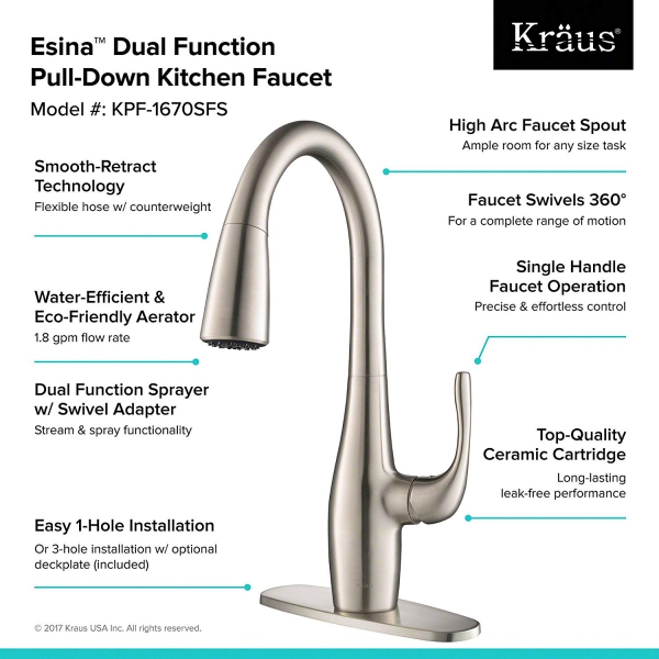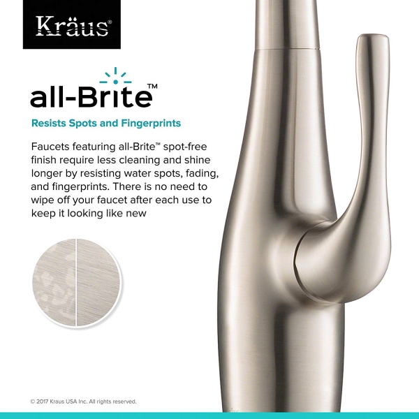 - Отделка нержавеющей стали All-Brite ™ Spot Free предотвращает появление водяных пятен и отпечатков пальцев; нет необходимости протирать кран после каждого использования