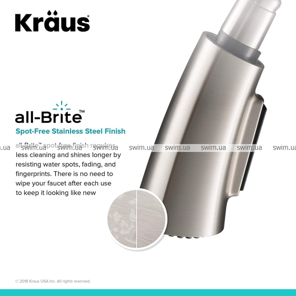 - Отделка нержавеющей стали All-Brite ™ Spot Free предотвращает появление водяных пятен и отпечатков пальцев; нет необходимости протирать кран после каждого использования.