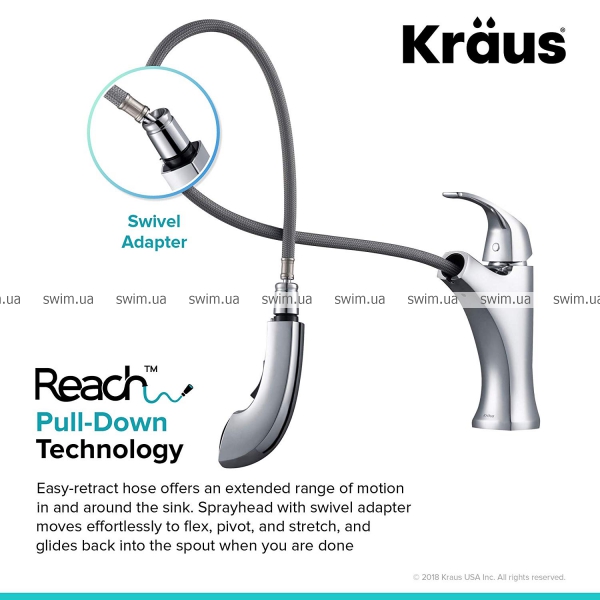 - Технология Reach, выдвижной излив и поворотный адаптер обеспечивают безупречную маневренность и гибкость при использовании.