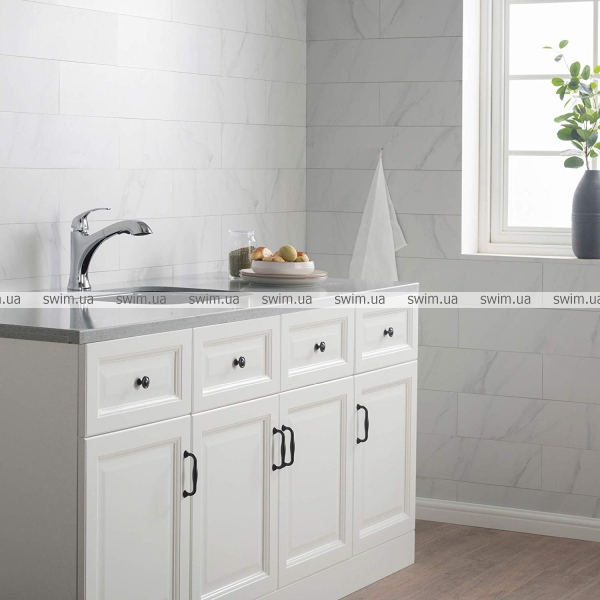 - Лейка, соединенная с гибким выдвижным шлангом, легко перемещается, а после использования плавно возвращается обратно, надежно закрепляясь в исходном положении.