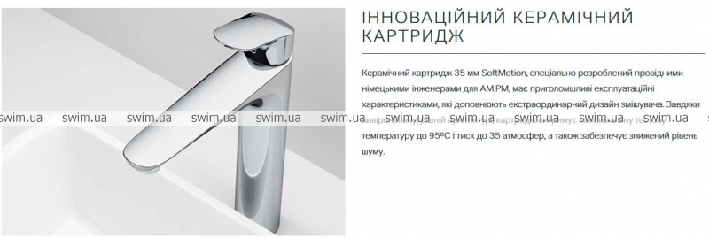 Эксклюзивная разработка: специально спроектирован для АМ.РМ керамический картридж SoftMotion 35 мм обеспечивает оптимальное регулирование температуры, а также позволяет выдерживать любые перепады давления.