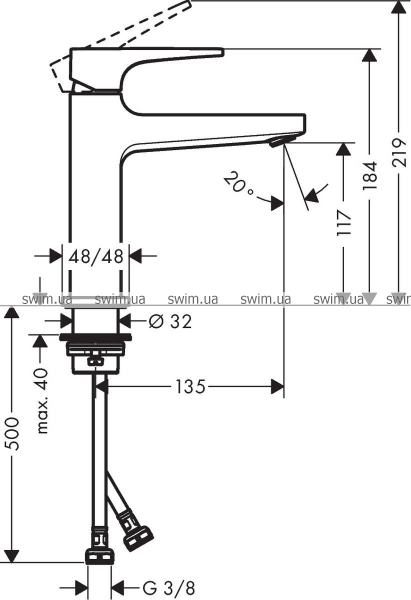 - состоит из: однорычажный смеситель для раковины, слив/перелив