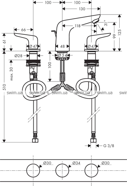 - состоит из: смеситель для раковины на 3 отверстия, слив/перелив