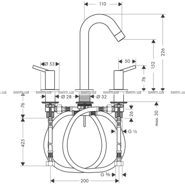 - состоит из: смеситель для раковины на 3 отверстия, слив/перелив