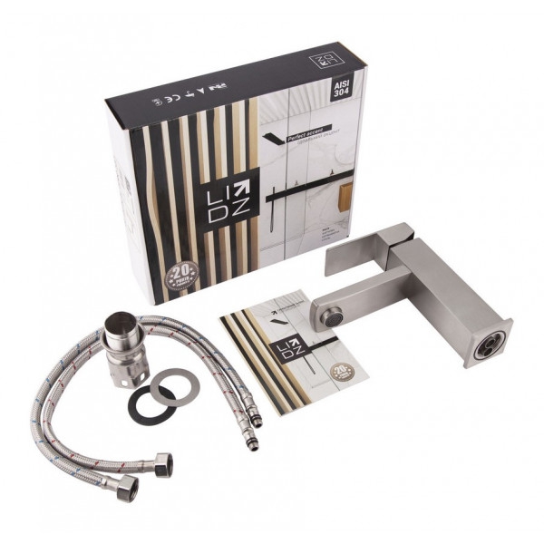 Смеситель для раковины Lidz (NKS) 10 30 001 00 изготовлен из нержавеющей стали, которая не подвержена коррозии, устойчива к ударам и трещинам. Никелированная брашированная поверхность придает смесителю не только долговечность, но и оригинальный внешний вид. Интенсивность водного потока и температура регулируются с помощью перемещения рычага. Подключение воды происходит через гибкие шланги с диаметром подключения 1/2", которые входят в комплект поставки.