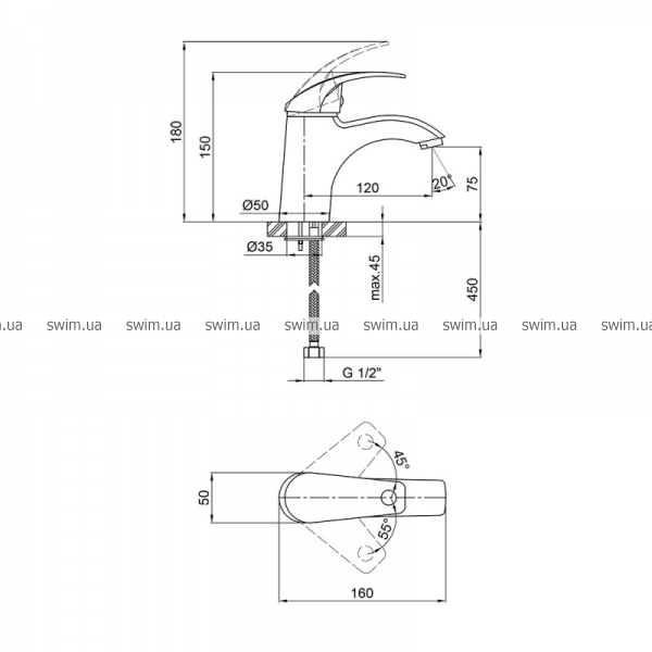 - Длина излива, мм: 120