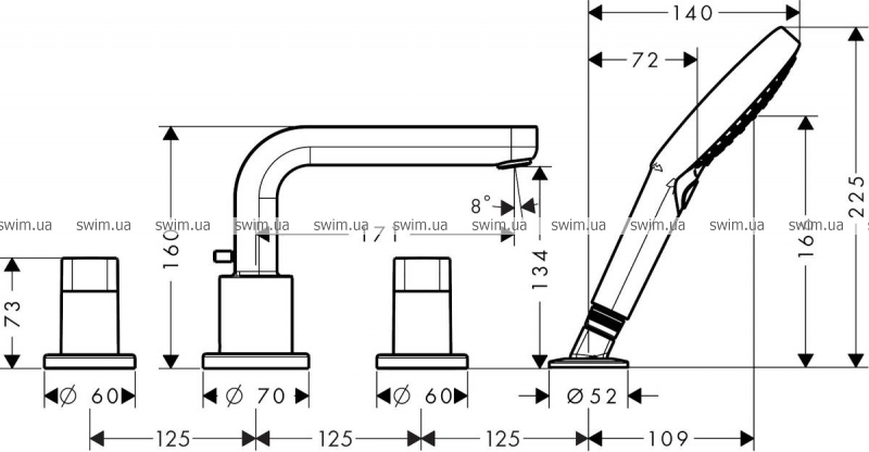 - комплект поставки: излив на ванну с переключателем, рукоятки, розетка