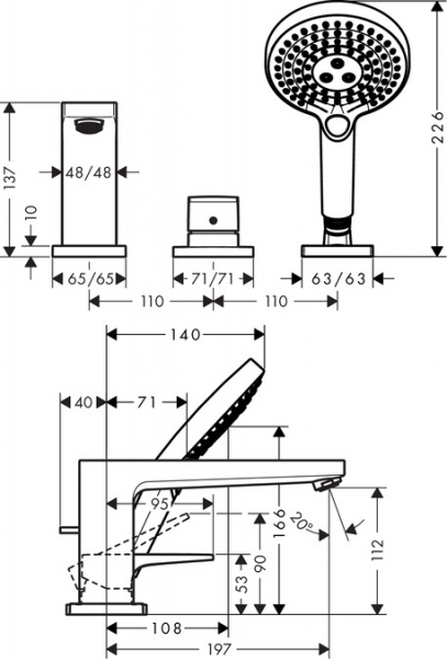 - состоит из: Смеситель для ванны на 3 отверстия, однорычажный, ручной душ, держатель для душа, душевой шланг
