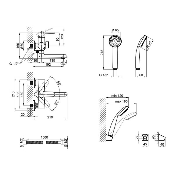 - Дополнительные характеристики Габариты лейки для ручного душа: 215х80х60. Длина душевого шланга - 1500 мм.
