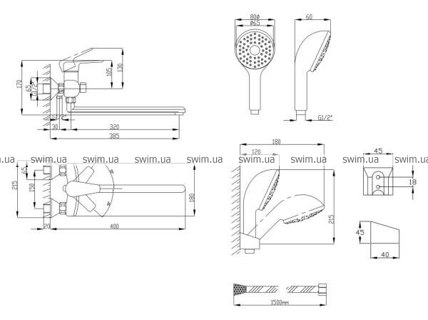 • Комплектация     Смеситель, лейка для ручного душа, душевой шланг, держатель для ручного душа, крепежи