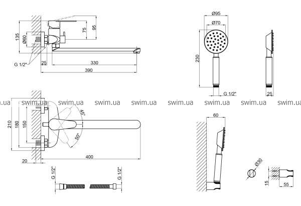 - Комплектация Смеситель, лейка для ручного душа, душевой шланг, кронштейн для ручного душа, крепежи.