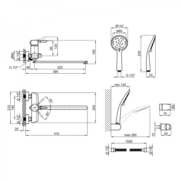 - Комплектация: смеситель, лейка для ручного душа, душевой шланг, кронштейн для ручного душа, крепежи.